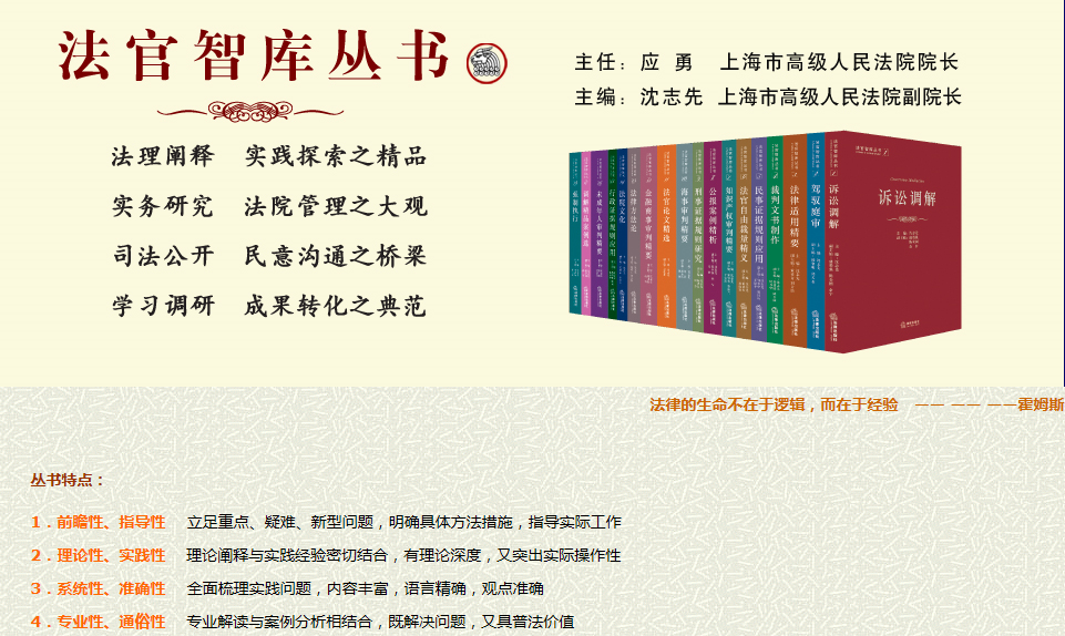 法官智库丛书的编撰过程是培植法治理念,树立“忠诚、为民、公正、廉洁”的价值观念,营造积极向上、调研学习的法院文化的过程。公平正义的理念决定了法官在办案过程中的利益衡量和裁量尺度,对裁判结果有着直接的影响。丛书主编沈志先强调:《法官智库丛书》是一套审判实务性的学术著作,要体现上海审判水准,具有实践的广度。丛书编撰的过程是法官自我学习、总结、提高,自我教育的过程,也是法官的知识储备自我更新的过程。组织编写出版《法官智库丛书》的过程,是梳理实践中的疑难问题,归纳、总结审判经验,学习法学理论,解决实践问题的过程,是法官的法学素养、司法技能与司法经验不断提高的过程。